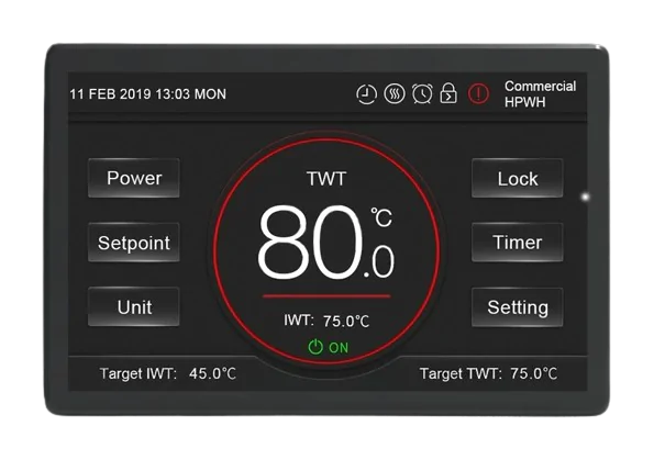 Универсальный многофункциональный сенсорный контроллер с множеством интеллектуальных функций, таких как недельный таймер, система управления зданием, сеть управления и мониторинга 4G, режимы работы (охлаждение/отопление/ГВС), экран блокировки/разблокировки, индикация температурных кривых, журнал неисправностей, дисплей калибровки и т. д. Индикация желаемой/текущей температуры до 0,5 °C позволяет контролировать температуру воды с высокой точностью.