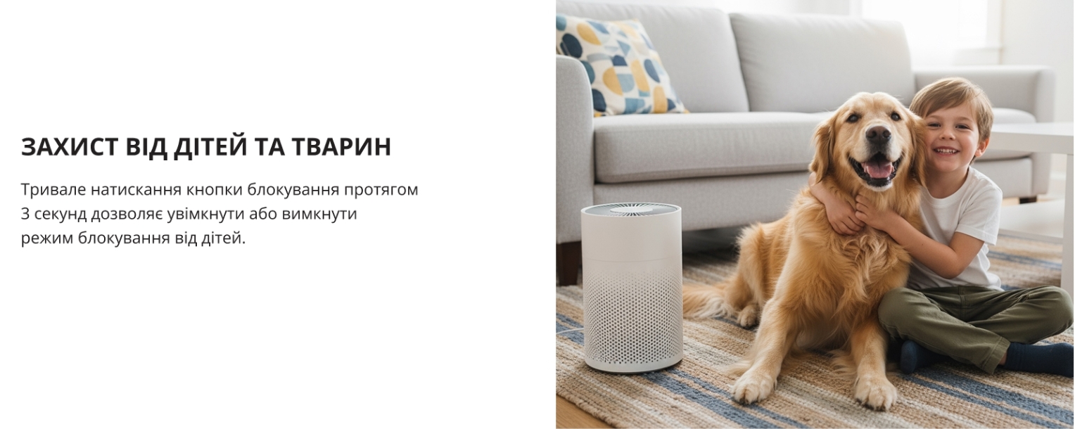 Автоматичний режим буде дбати про якість повітря без вашої участі, спираючись на показання датчика забруднення, очищувач вибирає потрібну інтенсивність очищення, а захист від дітей забезпечить збереження ваших персональних налаштувань.