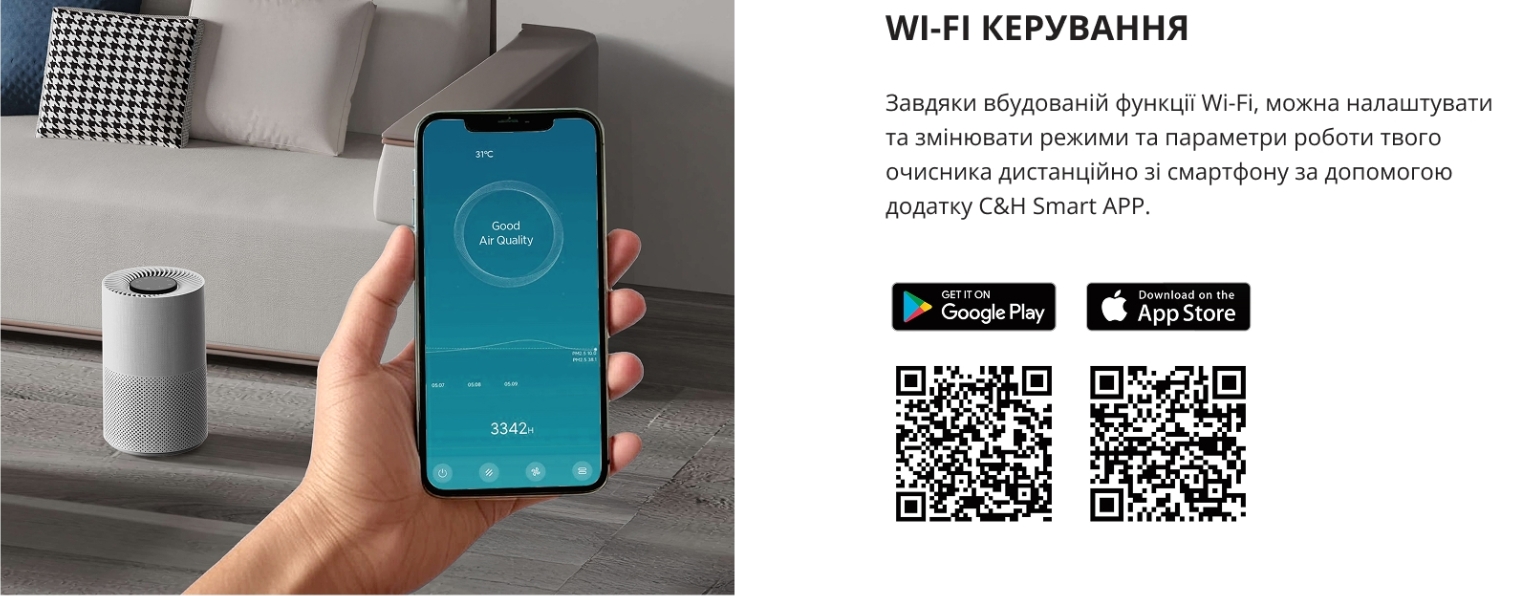Керуйте якістю повітря в приміщенні дистанційно, завдяки WI-FI управлінню через додаток C&H Smart, всі функції доступні у вашому смартфоні.
